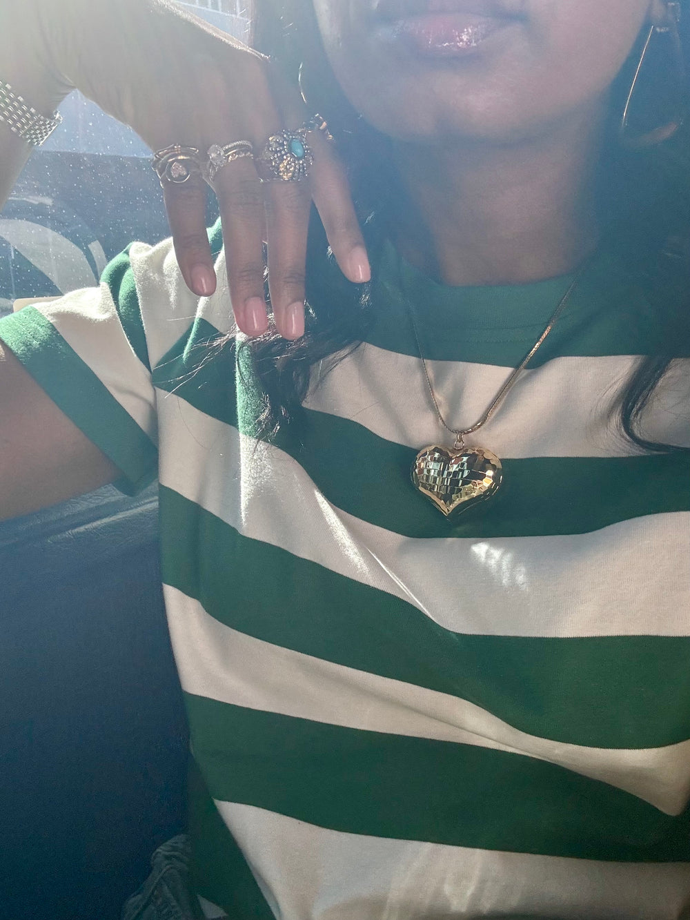 Make a statement with the Puffy Heart Chain, featuring a lightweight 1.5" gold-plated brass heart pendant on a durable synthetic pearl and gold plated chain. This playful necklace adds a touch of charm and uniqueness to any outfit, perfect for expressing your unique style with a fun, eye-catching accessory.