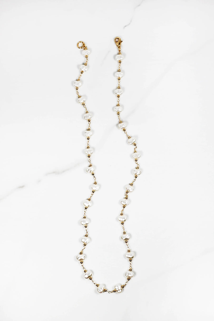 This 14k gold plated brass and faux pearl chain is the perfect mix of classic and modern. Featuring luminous pearls and a rich gold-filled chain, it’s a versatile piece that adds just the right touch of shine to any outfit. Wear it solo for a timeless look or layer it with your favorite necklaces for a stylish statement.