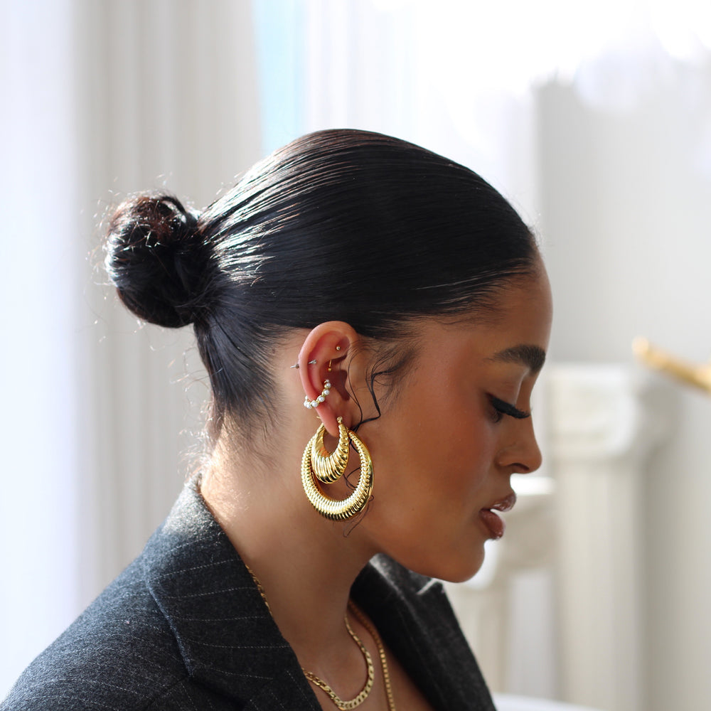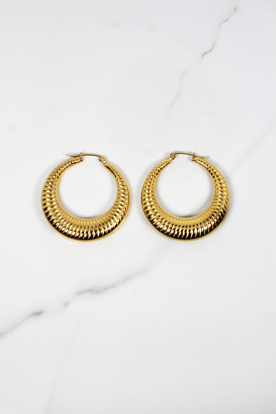 Crafted from stainless steel and plated with 18k gold, these hoops are designed to resist tarnishing and maintain their stunning appearance.