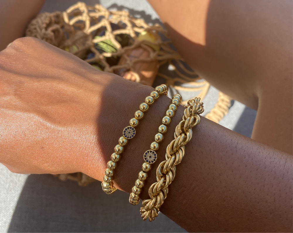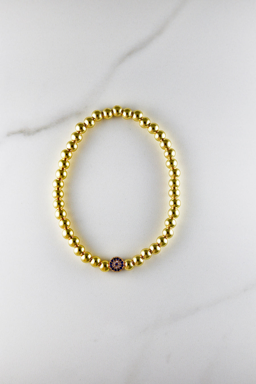 The Beaded Evil Eye Bracelet - a stunning accessory to elevate your look! Made with gold plated beads, this stretchy bracelet features 5mm gold balls and a captivating 5mm eye bead.