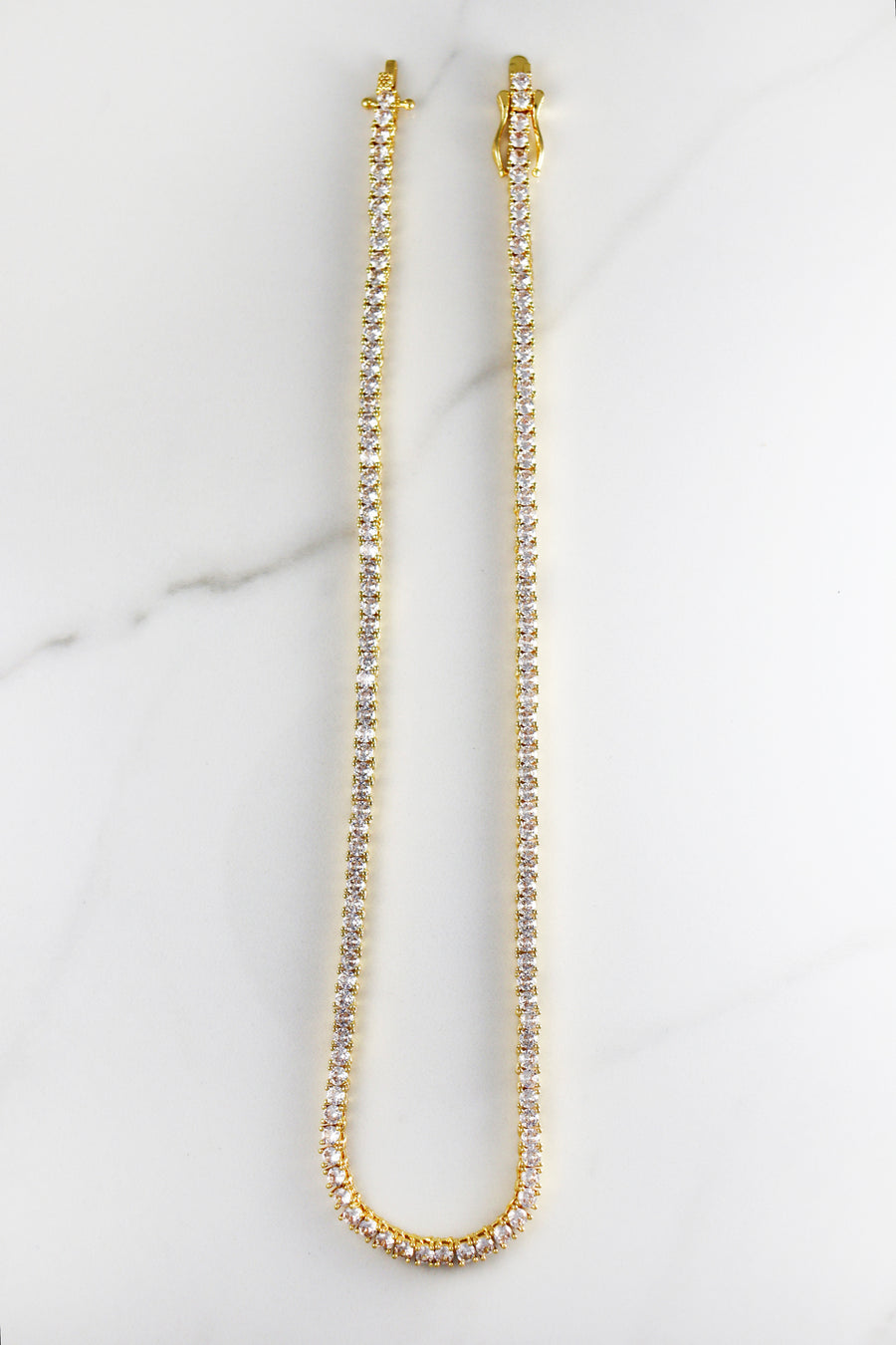 Elevate your style with this Gold Plated Brass Tennis Choker, featuring sparkling 3mm CZ stones that catch the light beautifully. Designed to sit perfectly around your neck, it adds a refined touch to both casual and formal looks. Durable brass with a gold finish ensures lasting shine, making this choker a timeless addition to your jewelry collection.